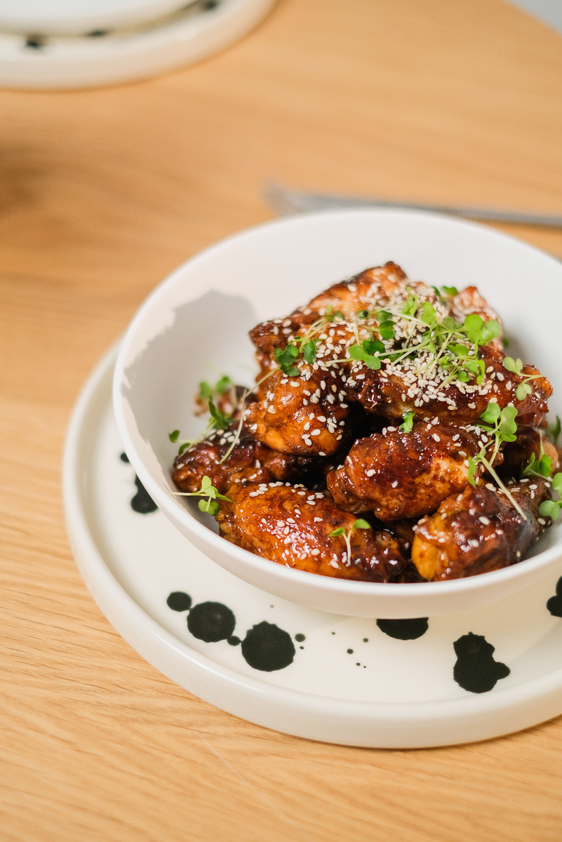 - Замариновать крылышки 1-2 часа в смеси оливкового масла, соевого соуса, горчицы и специй.