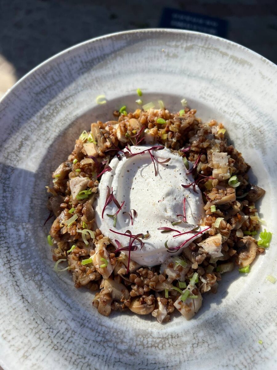 Гречка с курицей, грибами и муссом из пармезана