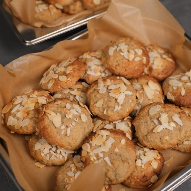 - Разделить массу на кусочки по 50-60 г, сформировать печенья, выложить на противень, застеленный пергаментом, украсить миндальными лепестками. Отправить в духовку, разогретую до 180 градусов на 25 минут.
