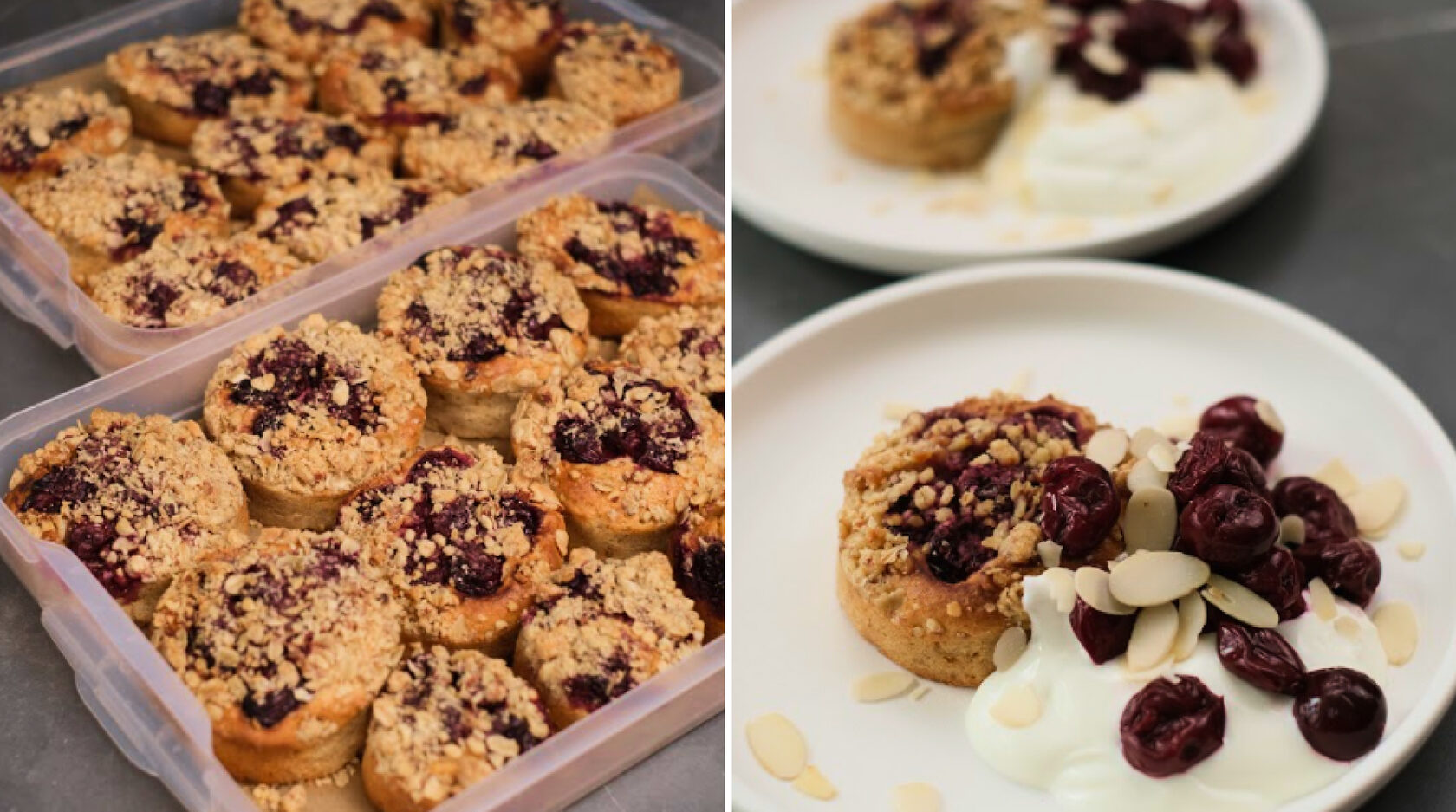 - Формы смазать маслом, вылить тесто на ⅔ объема формы, выложить сверху вишню, посыпать крошкой крамбла и отправить в духовку, разогретую до 170 градусов, на 40–50 минут до румянца и готовности (проверять шпажкой, она должна выходить сухой).