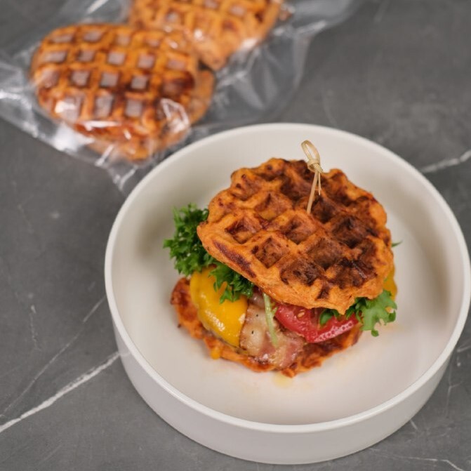 - Разогреть вафельницу, при необходимости смазать панели маслом, выложить тесто таким образом, чтобы оно заполнило практически весь периметр секции тонким слоем. Жарить на средней мощности до румянца.